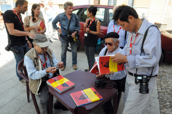 Casquette et béret basque… Nos photoreporters vietnamiens vendent leurs livres « Ceux du Nord’. (Photo Ph Rochot)