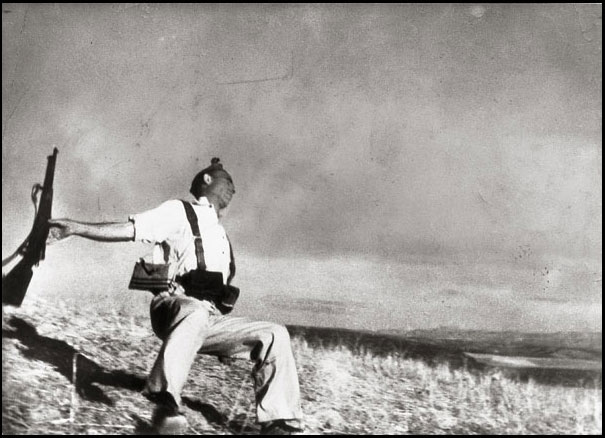 Quand on parle de Robert Capa, on ne peut éviter de montrer cette image du combattant qui s’effondre avec son fusil sur une colline de la région de Cordoue en 1936. RSF ne prend pas de risques et légende ainsi la photo : « Républicain tombant ». Je pensais pourtant que l’homme avait trouvé la mort dans cette fusillade. Les légendes comme celle de « Life » qui date l’événement en 1937, ne prêtent à aucune confusion: « l’appareil Photo de Robert Capa surprend un soldat espagnol à l’instant où il tombe, frappé d’une balle dans la tête ».