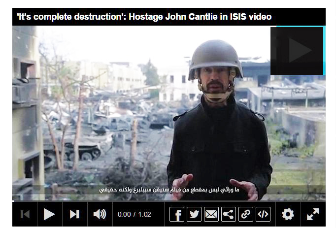 *John Cantlie a été capturé une première fois par des djihadistes le 19 juillet 2012 au nord de la Syrie en compagnie du photographe néerlandais Jeroen Oerlemans. Les deux hommes seront finalement libérés par l’Armée syrienne libre le 26 juillet. John Cantlie est retourné en Syrie en novembre 2012 avec le journaliste américain James Foley, mais tous deux ont été capturés près de la frontière turque. James Foley sera exécuté le 18 août 2014.