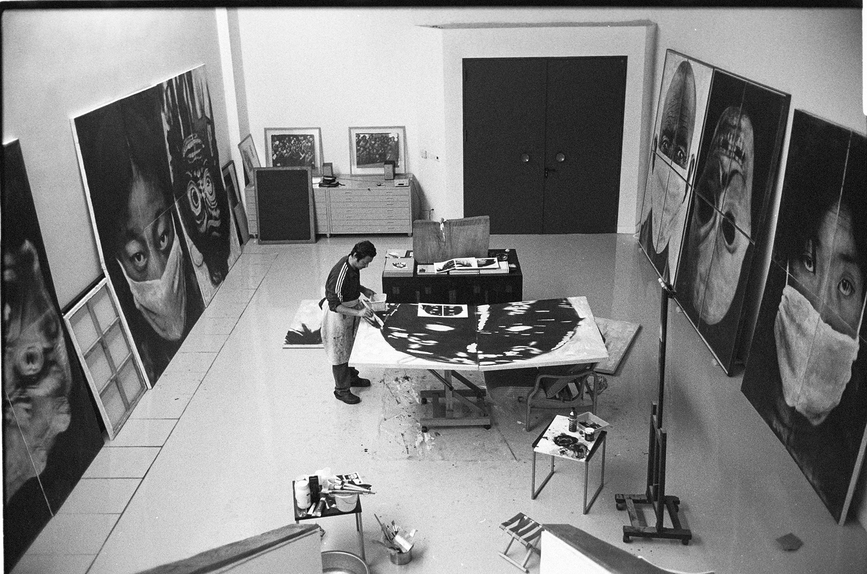 Ses portraits de condamnés à mort ou de Tibétains dépassent deux fois la taille d’un homme: œuvres monumentales, forcément monumentales, réalisées à la chambre grand format et qui ne trouvent leur place que dans les vastes ateliers de l’artiste, dans cette atmosphère brumeuse et paisible de la banlieue de Pékin. Ses œuvres sont à la taille de « l’offrande » qu’il veut faire: « offrande au peuple du Tibet, offrande au Mandala, offrande aux figures disparues, offrande à ma mère… » Ces portraits se retrouvent enfin sur des pierres éparpillées, incrustés dans la roche, dans le caillou, proches de la terre. Ces visages vont ainsi du géant à l’infiniment petit, comme s’il était impossible de les situer dans la dimension de l’univers.