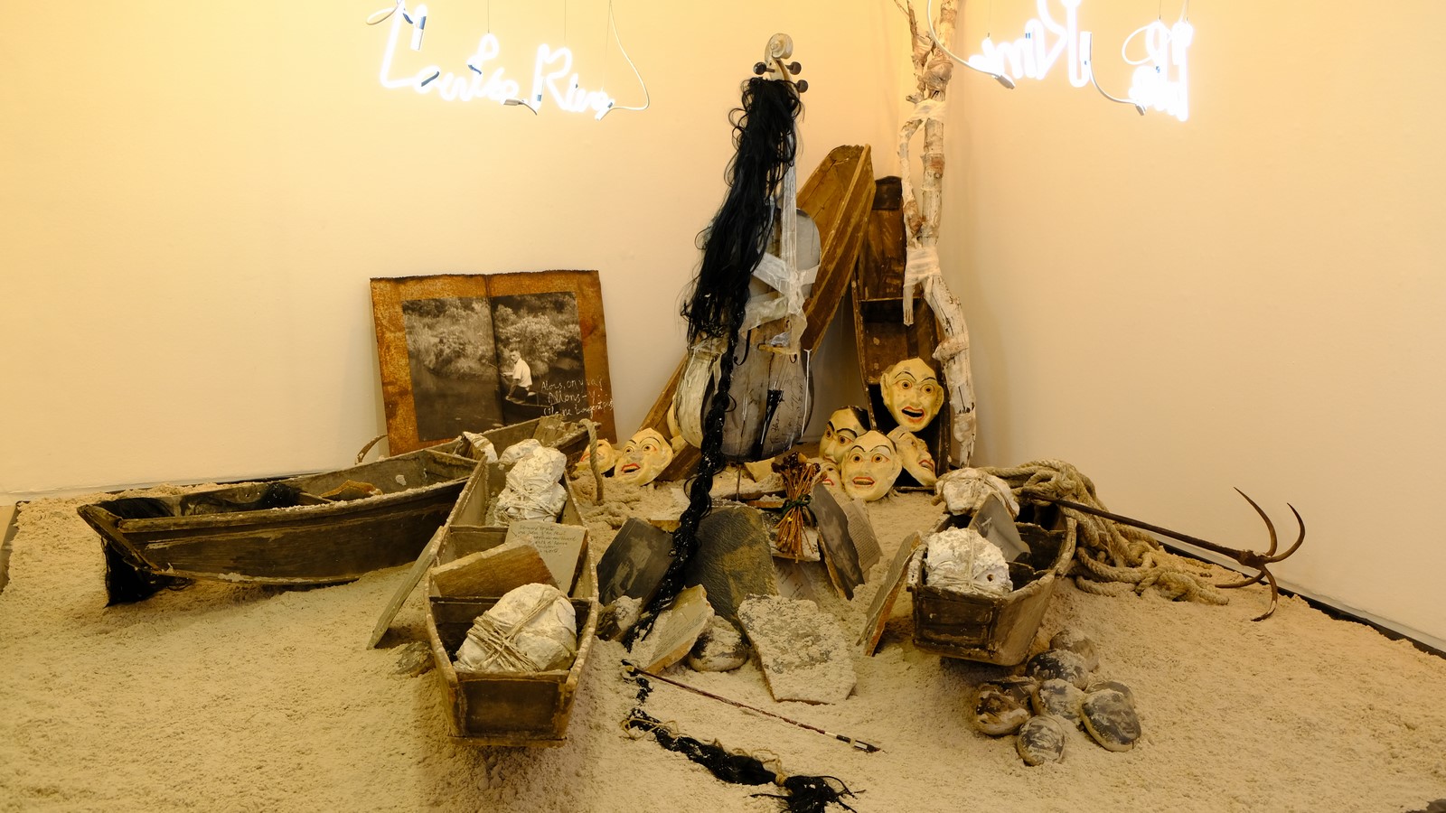 Que peut-il bien rester dans la tête d’un homme qui a vécu son enfance dans les crimes, la misère et les drames familiaux engendrés par la révolution culturelle ? La tourmente mais aussi le désir de quiétude qu’il va trouver dans les monastères tibétains ou même dans la mort. Des œuvres exposées à la Maison Européenne, je retiendrai encore celle-ci intitulée « l’autre rive » où de fragiles barques de bois lestées de pierres tombales, conduisent vers des visages aux yeux exorbités.