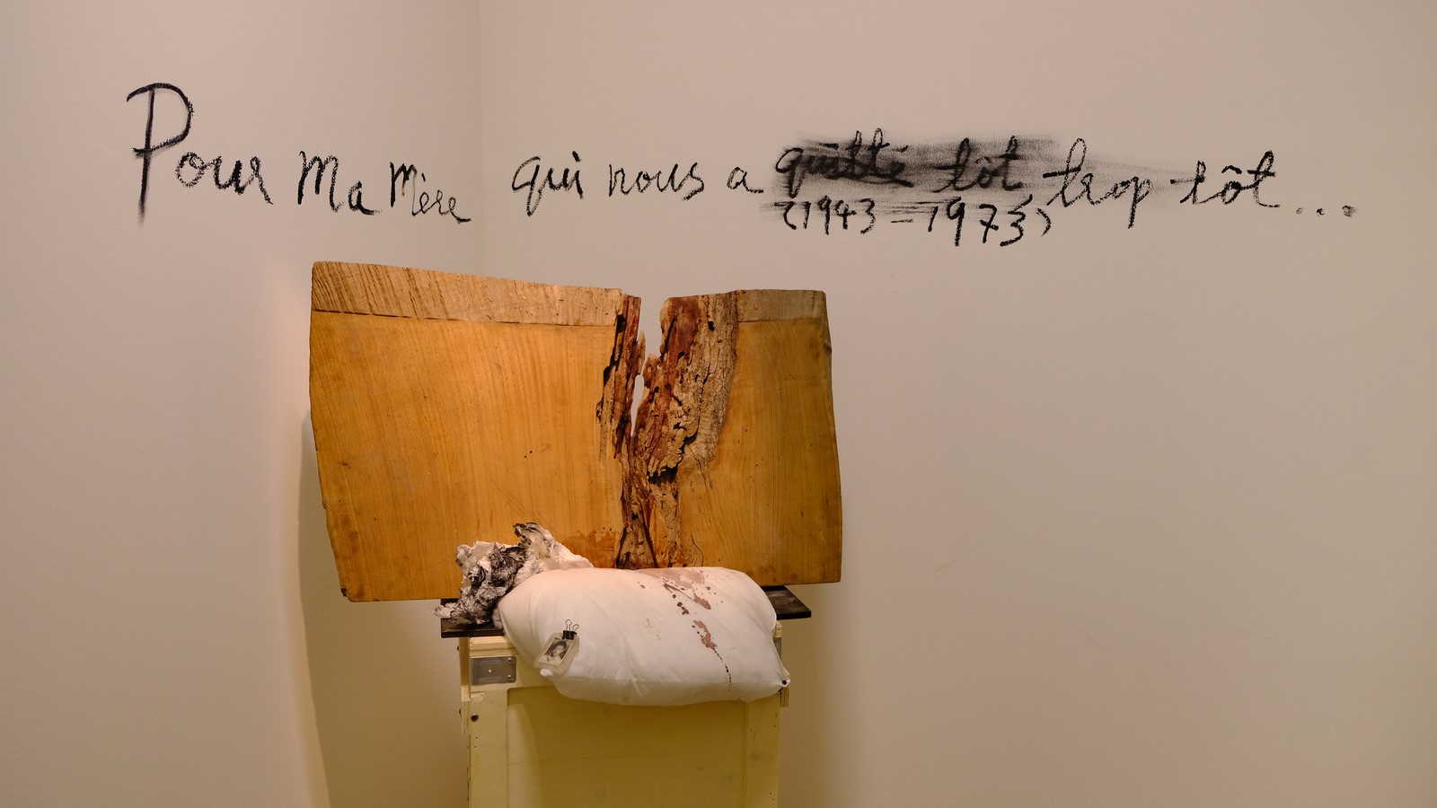 Le souvenir de la révolution culturelle, de ses tribunaux populaires et de ses exécutions publiques auxquelles il était contraint d’assister a souvent hanté l’artiste, tout comme la mort brutale de sa mère qui s’est jetée sous un train devant ses yeux alors qu’il avait huit ans. « Je voulais retrouver mes souvenirs d’enfance » dit-il très simplement. Au-delà de l’image il écrit sur le mur la légende de son œuvre dédiée à celle qui lui a donné la vie, morte à l’âge de trente ans: « Pour ma mère qui nous a quittés trop tôt ». L’existence misérable de cette femme est représentée par une souche d’arbre éclatée devant laquelle il a déposé un coussin blanc ensanglanté : fissures, déchirements, horreurs d’un drame impossible à oublier.