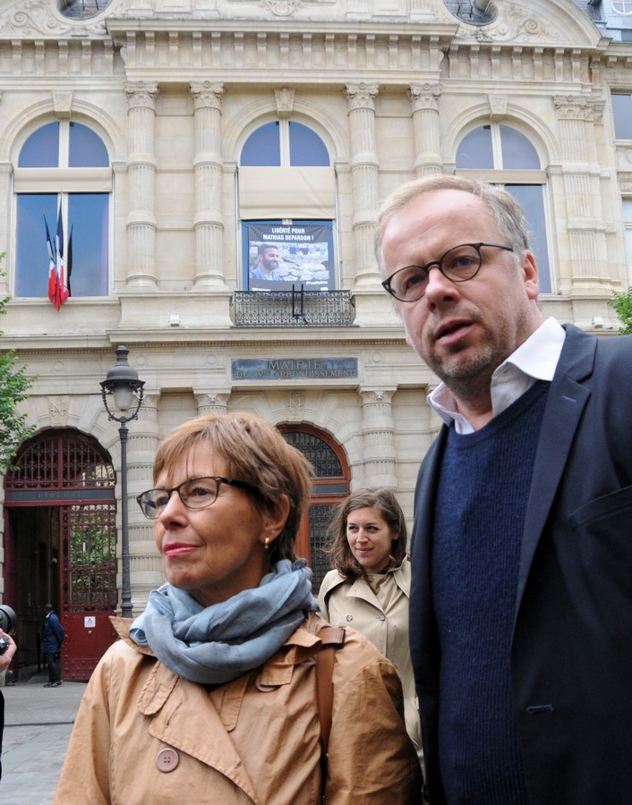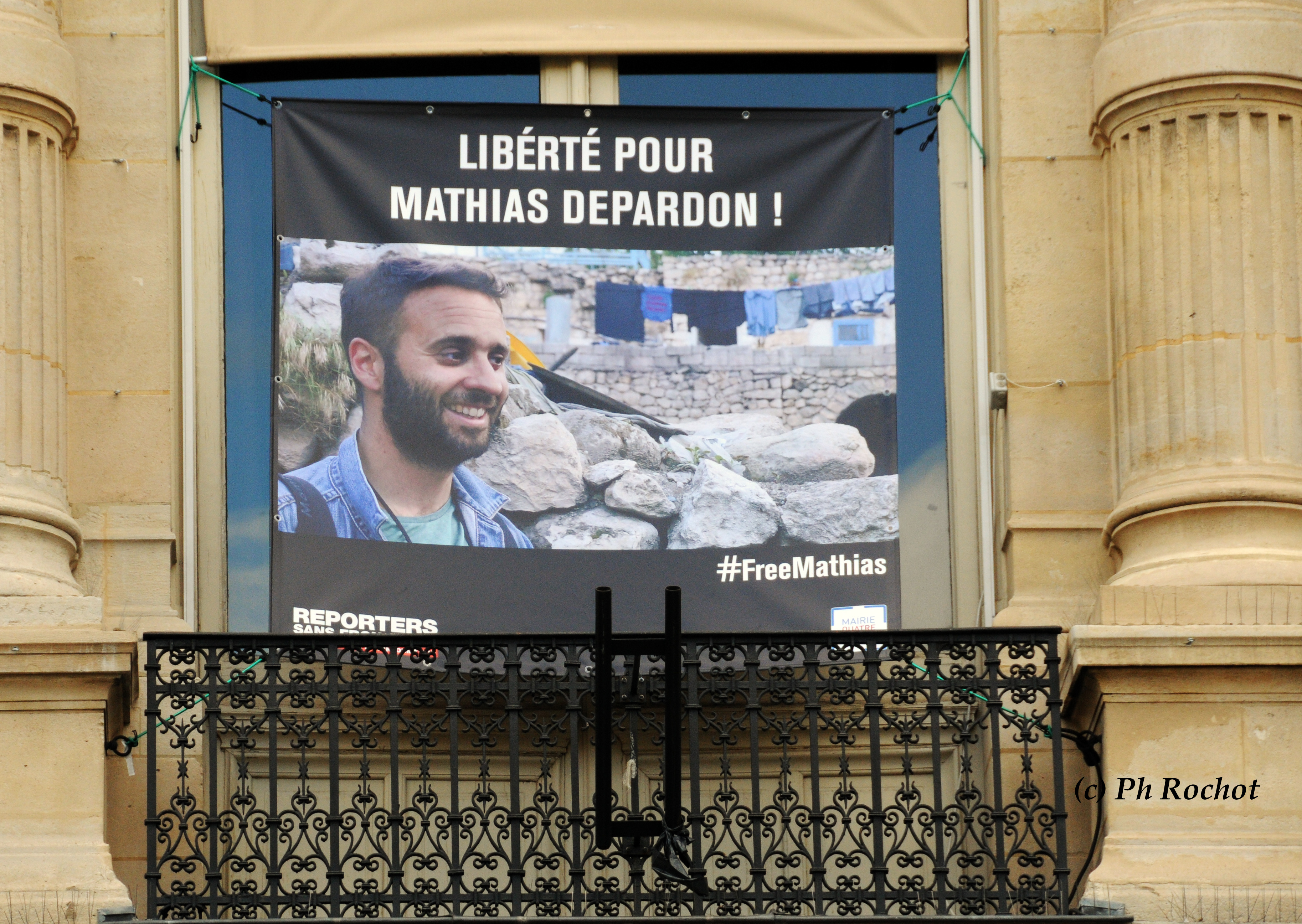 Paris Mairie 4ème: banderole pour la libration de Mathias Depardon. (PR)