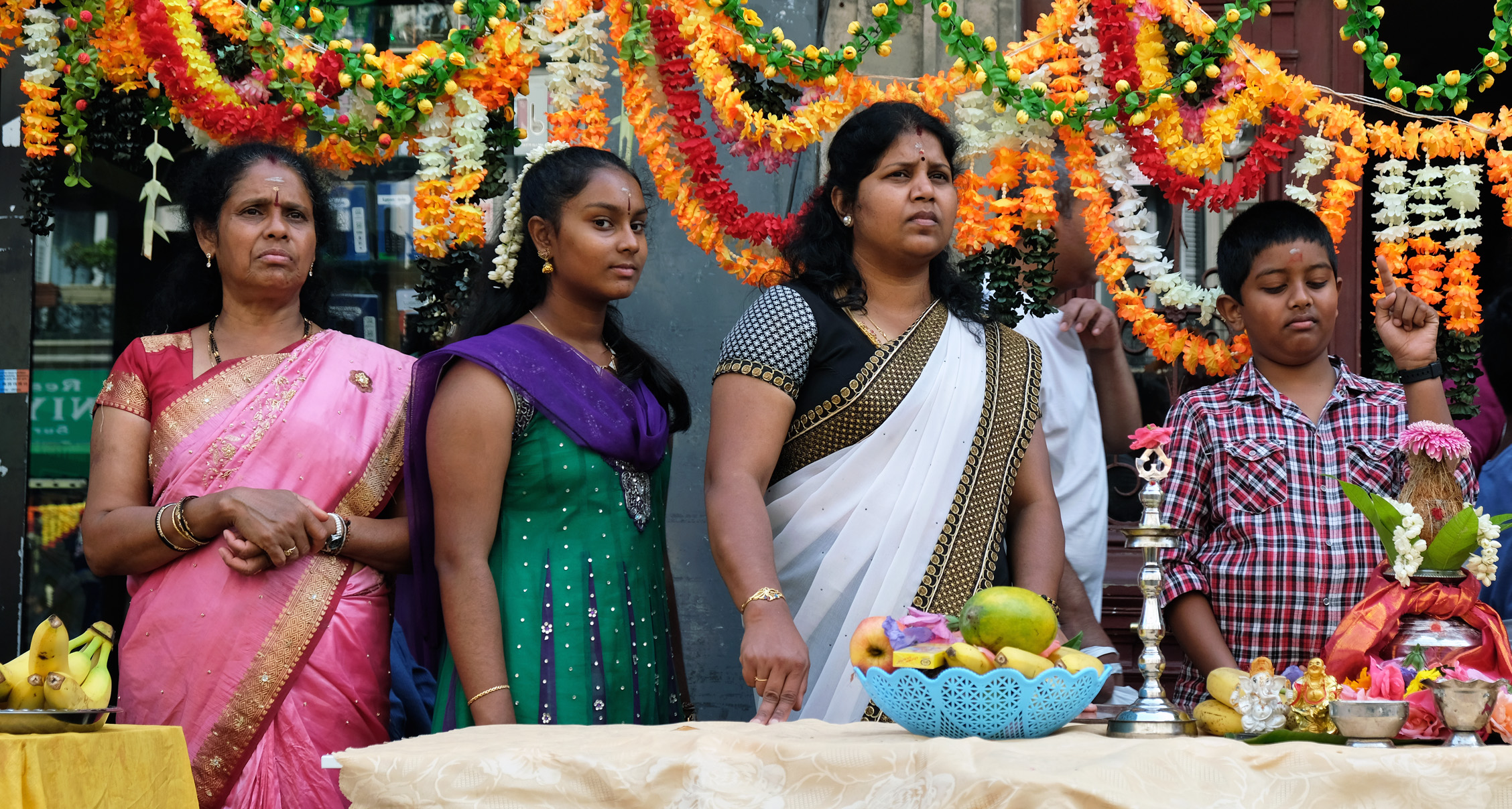 Hommes et femmes ont soigné leur tenue : saris et foulards de couleur jaune, rose ou bleue, bijoux, ornements, colliers d’or ou simplement dorés, diadèmes étincelants qui se détachent sur des cheveux noirs, longs et soyeux, parures éclatantes comme si cette fête était un mariage avec ce dieu de la sagesse, de l’intelligence et de l’éducation. C’est aussi pour Ganesh qu’elles portent sur la tête des pots de fleurs où brûle le camphre.