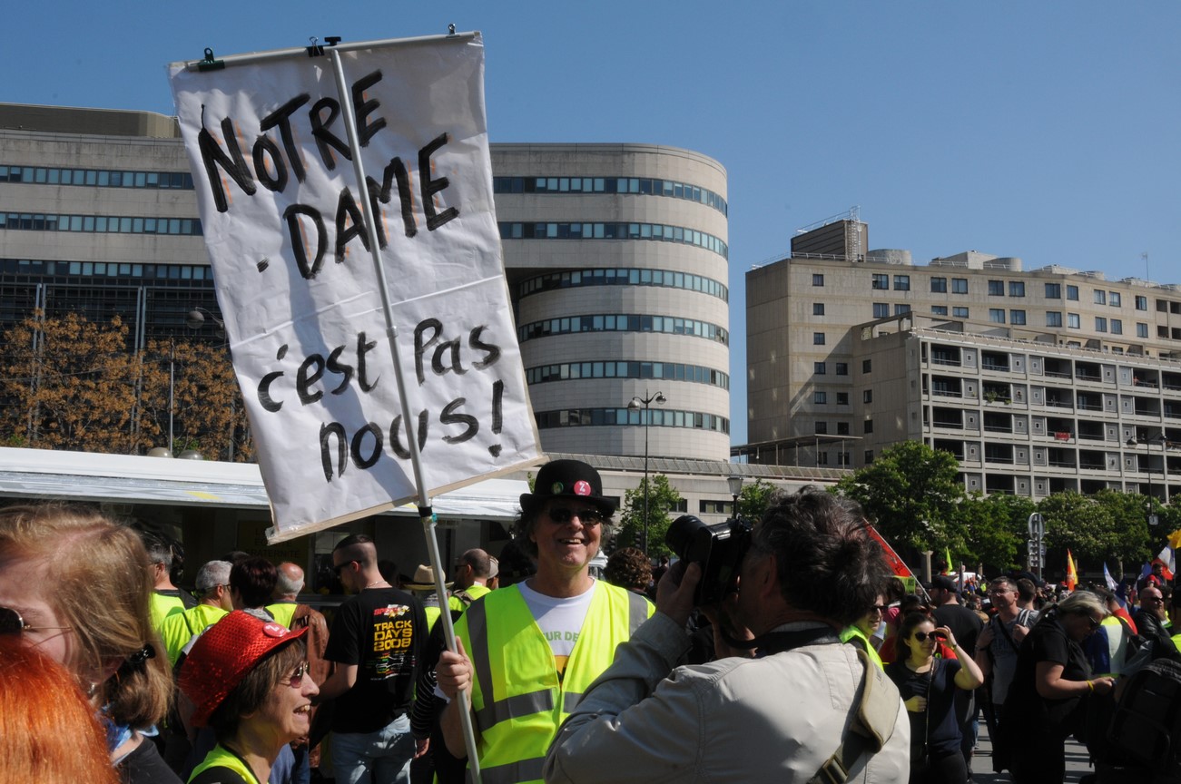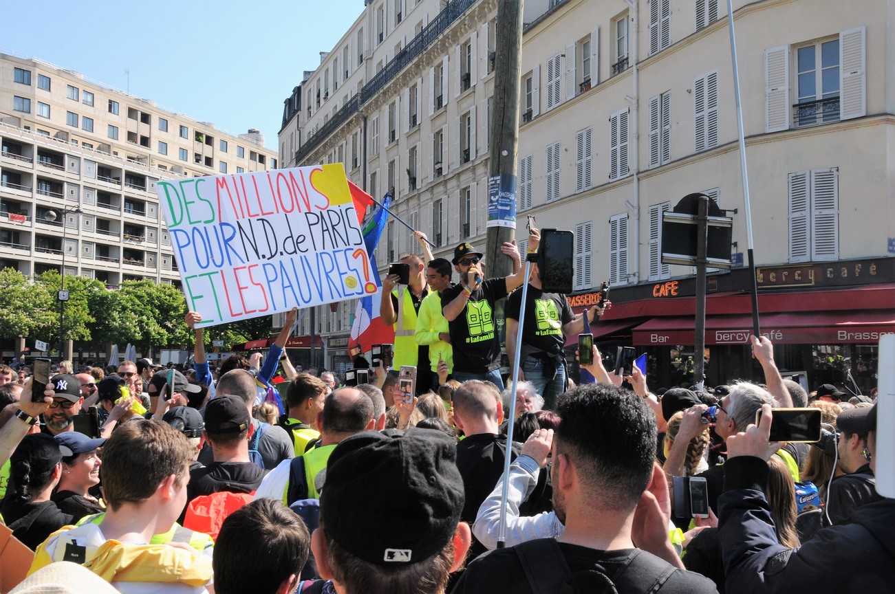 Il fallait s’y attendre, la campagne de dons qui a permis de récolter près d’un milliard d’euros pour la restauration de Notre-Dame de Paris a du mal à passer chez les gilets jaunes: « des millions pour Notre-Dame de Paris, et les pauvres ? ». Les slogans ne prêtaient guère à confusion durant cet acte 23. « Nous sommes toutes des cathédrales » disait un mouvement féministe baptisé « Vieilles et pas sages ». L’incendie de Notre-Dame ? De l’enfumage pouvait-on lire sur des pancartes dénonçant l’état français comme « un état pyromane ». Les slogans des gilets jaunes ont donc évolué en fonction de l’actualité brûlante de ces derniers jours mais on reste toujours très proche du courant complotiste observé depuis le début du mouvement.