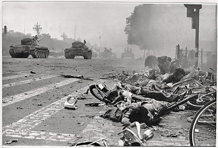 « Nous nous tenions par les mains en chantant l’Internationale. Je découvris alors que nous étions presque complètement encerclés. Seule une mince ouverture demeurait en direction du musée militaire. La police continuait à nous frapper de toutes ses forces et nous finîmes par retomber dans le square. C’est alors que les pistolets mitrailleurs entrèrent en action. De nombreux soldats mirent un genou à terre, tirèrent d’abord en l’air puis sur nos crânes et nos poitrines. Tout de suite les étudiants autour de moi commencèrent à perdre leur sang. Beaucoup moururent sur le coup… La Fédération autonome annonça que les étudiants allaient évacuer. Il n’était pas encore 5 heures. Mais soudain la seule ouverture fut bouchée : plus de trente blindés entrèrent sur la place… Ils avaient écrasé sur leur passage des tentes encore occupées de jeunes. Un grand nombre d’étudiants moururent. Un groupe se mit à courir pour tenter de dégager un passage entre les tanks… La plupart furent abattus… Nous vîmes de nombreux corps, certains s’agitant encore faiblement, certains empilés. Les soldats les mettaient dans de grands sacs en plastique. »