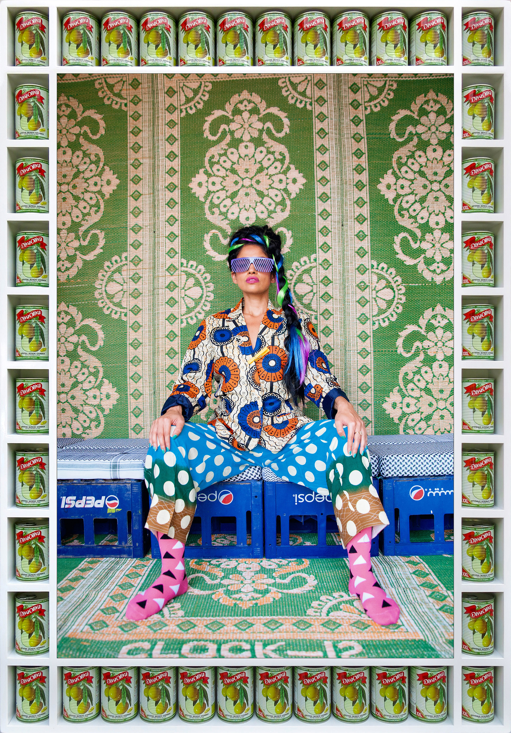A y regarder de plus près, on découvre la démarche intellectuelle de l’artiste Hussein Hajjaj : la provoc. Les photos elles-mêmes sont encadrées par une succession de petits casiers dans lesquels l’artiste a placé des cannettes de bière, des pots d’olives ou des boites de coca… Tout cet ensemble contribue à attirer le visiteur dans son univers dès la première image… Un univers qui a pour cadre le Maroc. Hajjaj est marocain, Britanno-marocain plutôt..