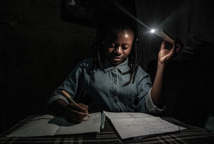 Photo de Arlette Bazshizi représentant sa soeur faisant ses devoirs à la lueur de son smartphone en raison des pannes d’électricité très fréquentes.