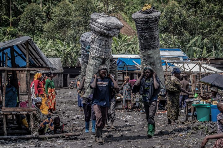 Des millions d’habitants de la région du Kivu dépendent entièrement du charbon de bois, souvent exploité illégalement, pour cuire leurs repas. Parc national des Virunga, RDC, décembre 2020. Transport du charbon de bois sur le marché rural de Kulupango à Goma ( Nord-Kivu.) Photo de Guerchom Ndebo pour la Fondation Carmignac.