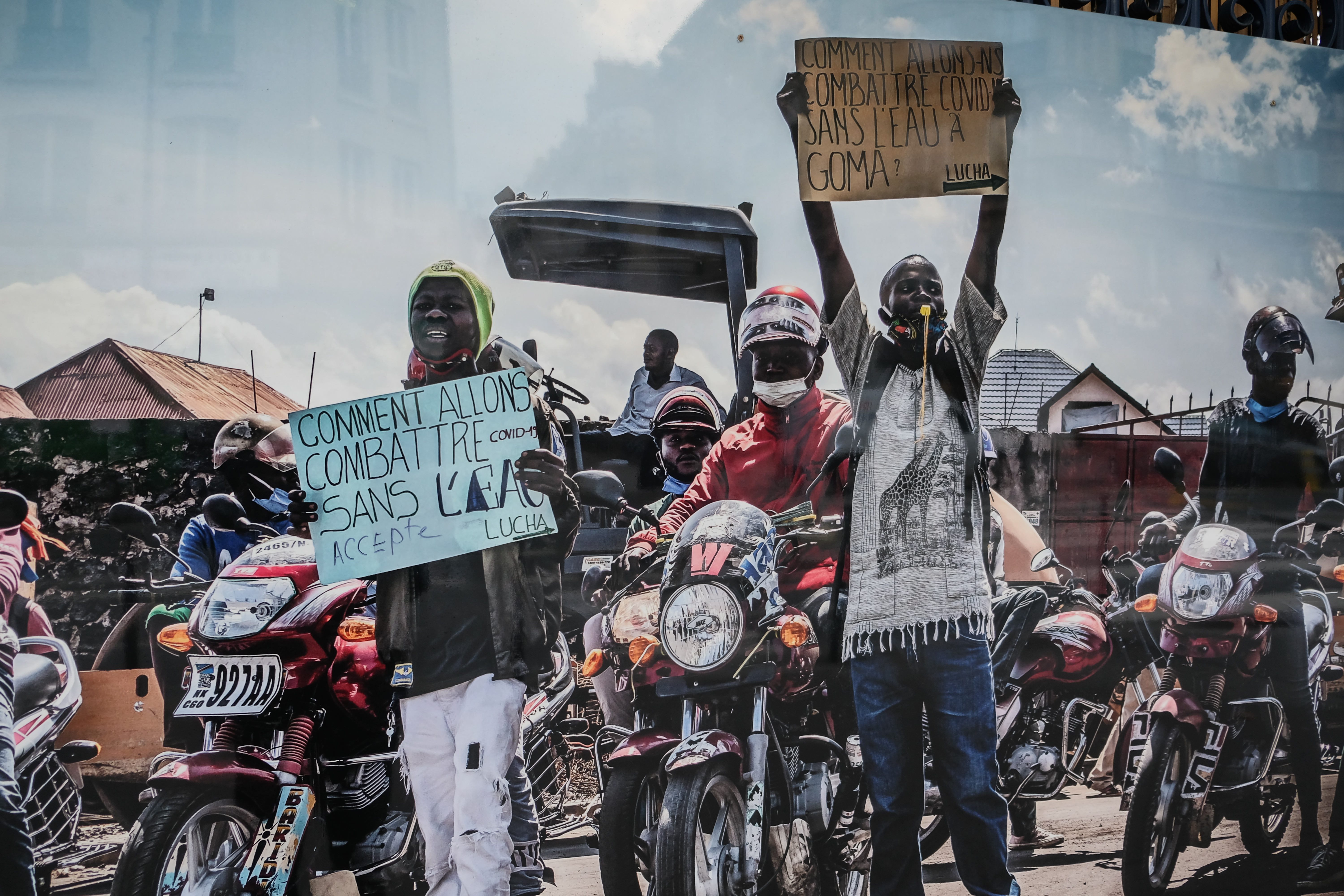 « Comment allons-nous combattre le Covid sans eau » disent les pancartes de ces manifestants de Goma. Photo de Pamela Tulizo.