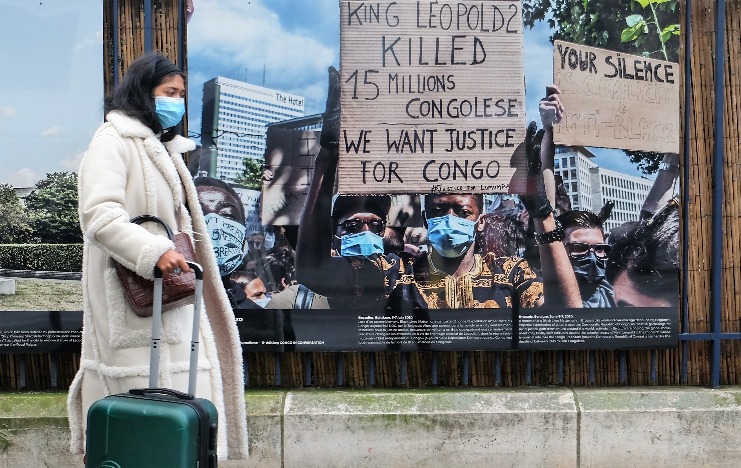 Le roi Léopold a tué 15 millions de Congolais dit cet homme lors d’une manifestation à Bruxelles en faveur du mouvement « Black Lives Matter ». Le traumatisme colonial reste très présent au Congo et ce chiffre des victimes du colonialisme est régulièrement avancé. Photo de Pamela Tulizo pour Prix Carmignac.