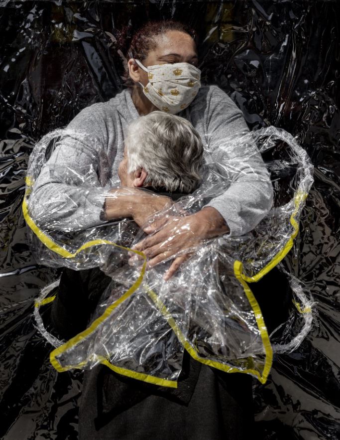 Je retiens de même ce cliché de Mads Nissen, tellement symbolique de la crise sanitaire mondiale que nous traversons. C’est l’étreinte que reçoit Rosa, une octogénaire d’un foyer pour personnes âgées de Sao Polo au Brésil, qui n’a eu aucun contact physique avec un proche depuis cinq mois. Adriana, son infirmière, a pris l’initiative de défier l’interdiction faite au personnel d’approcher les pensionnaires et de la serrer dans ses bras. Image d’amour et de tendresse où le message parvient à passer malgré les plastiques de protection qui semblent se transformer en ailes d’un ange imaginaire.