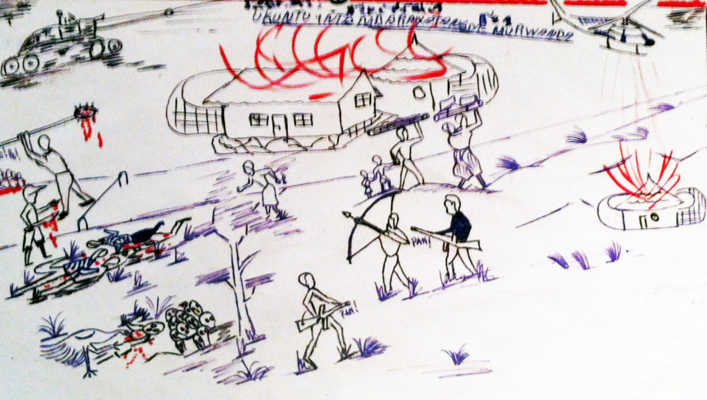 Dessin d’enfant rwandais tutsi, exposé au musée de la Shoah à Paris.
