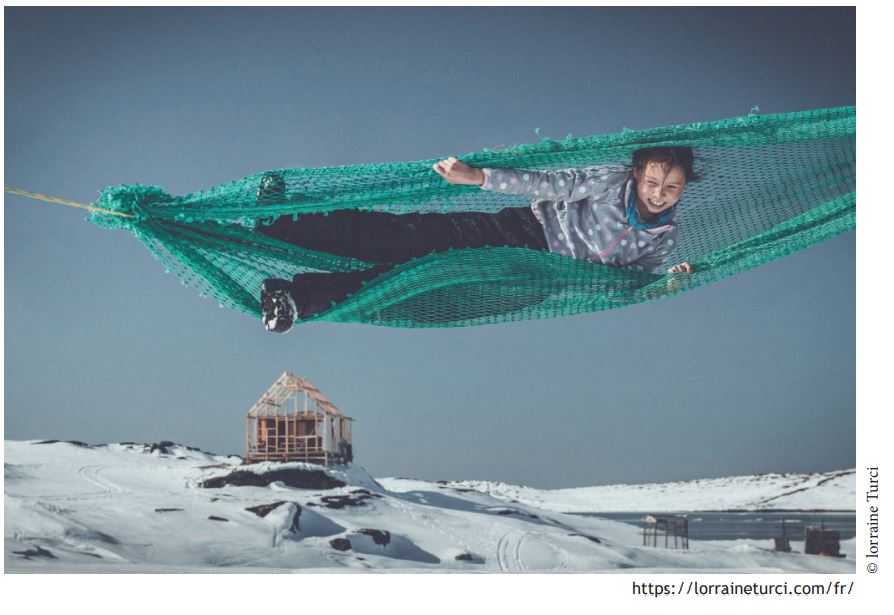 Lorraine Turci que l’on pourrait qualifier d’artiste-reporter a choisi un microcosme en traitant les changements climatiques dans un village inuit de 47 habitants. Ils vivent de la pêche à la morue, au beluga, à la baleine, se déplacent en bateau ou en chien de traineau mais voient leur mode de vie se transformer.