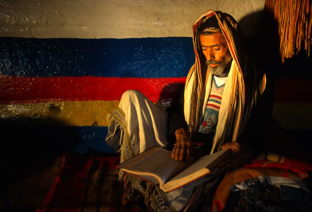 David Zabari, juif yéménite lisant un livre saint dans sa demeure de Saada. 1998. (c) Naftali Hilger.