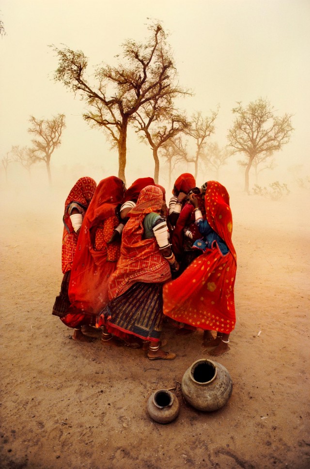 Il faut entendre Steve McCurry raconter comment il a saisi l’une de ses images préférées : celle de ces femmes indiennes regroupées autour d’un arbre et se protégeant d’un vent de poussière.
