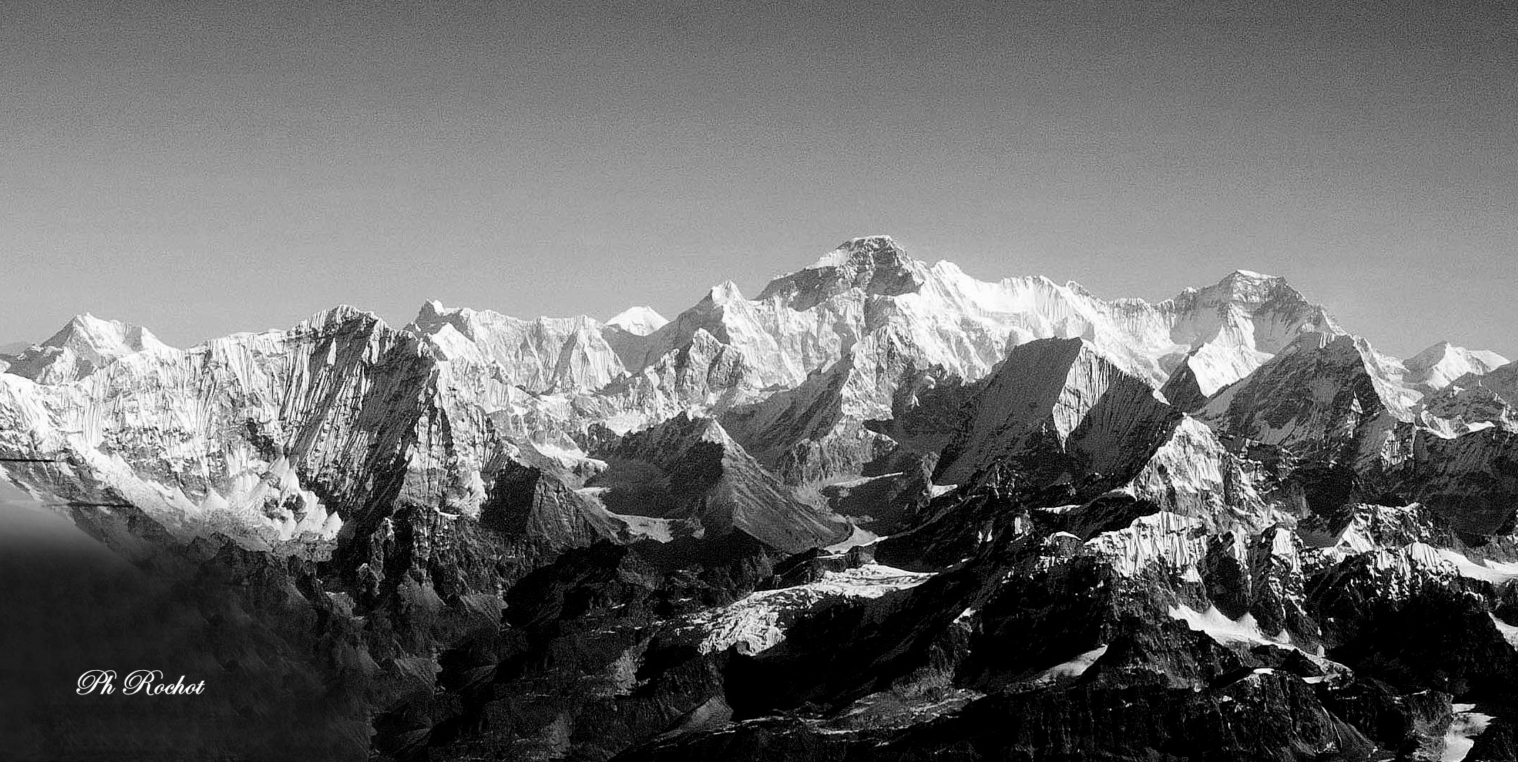Chaine de l’Himalaya : mont Everest. Le Cho Oyu se trouve à l’ouest du plus haut sommet du monde. Gauche sur l’image…(Photo Ph Rochot)