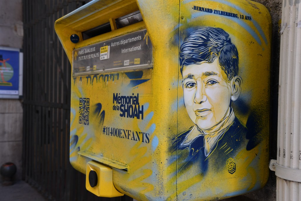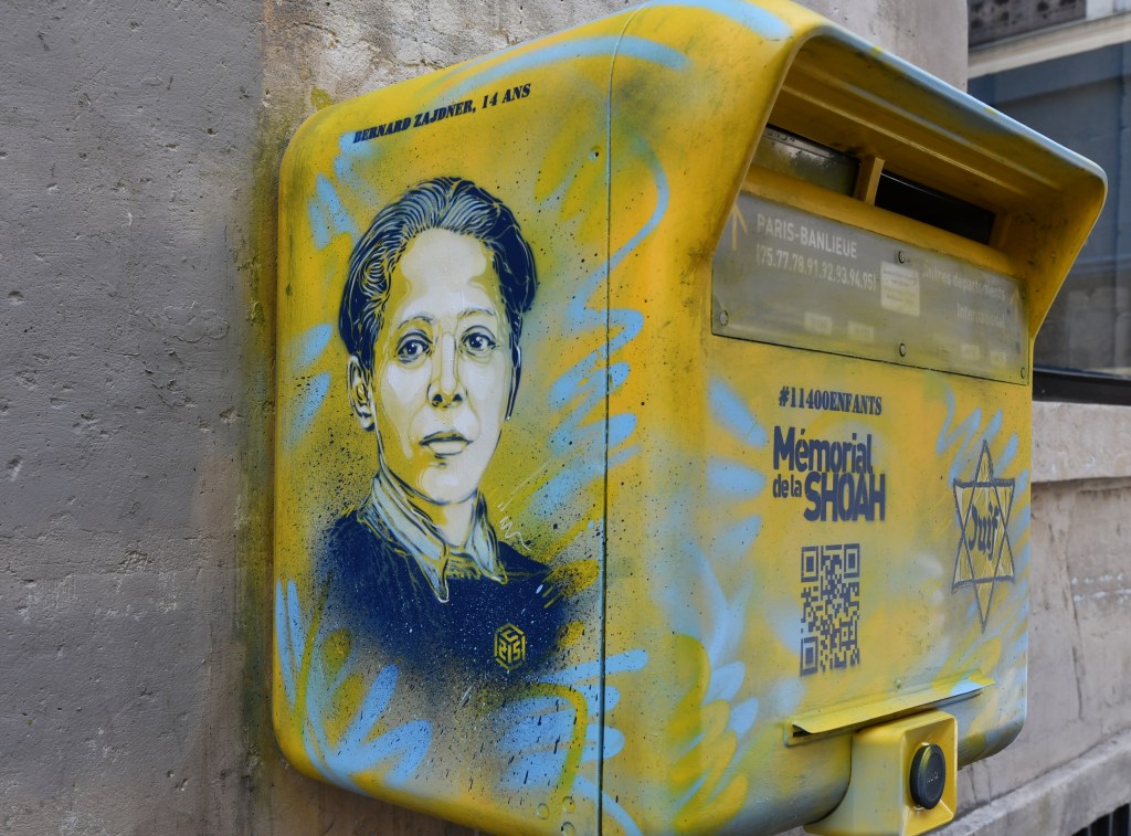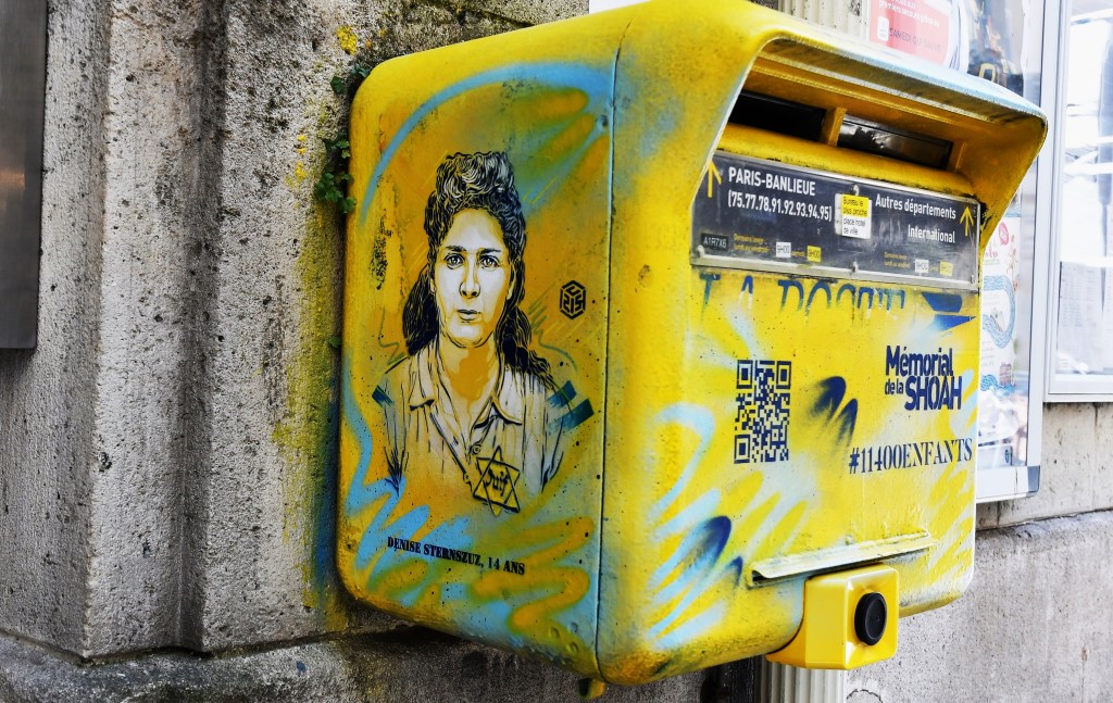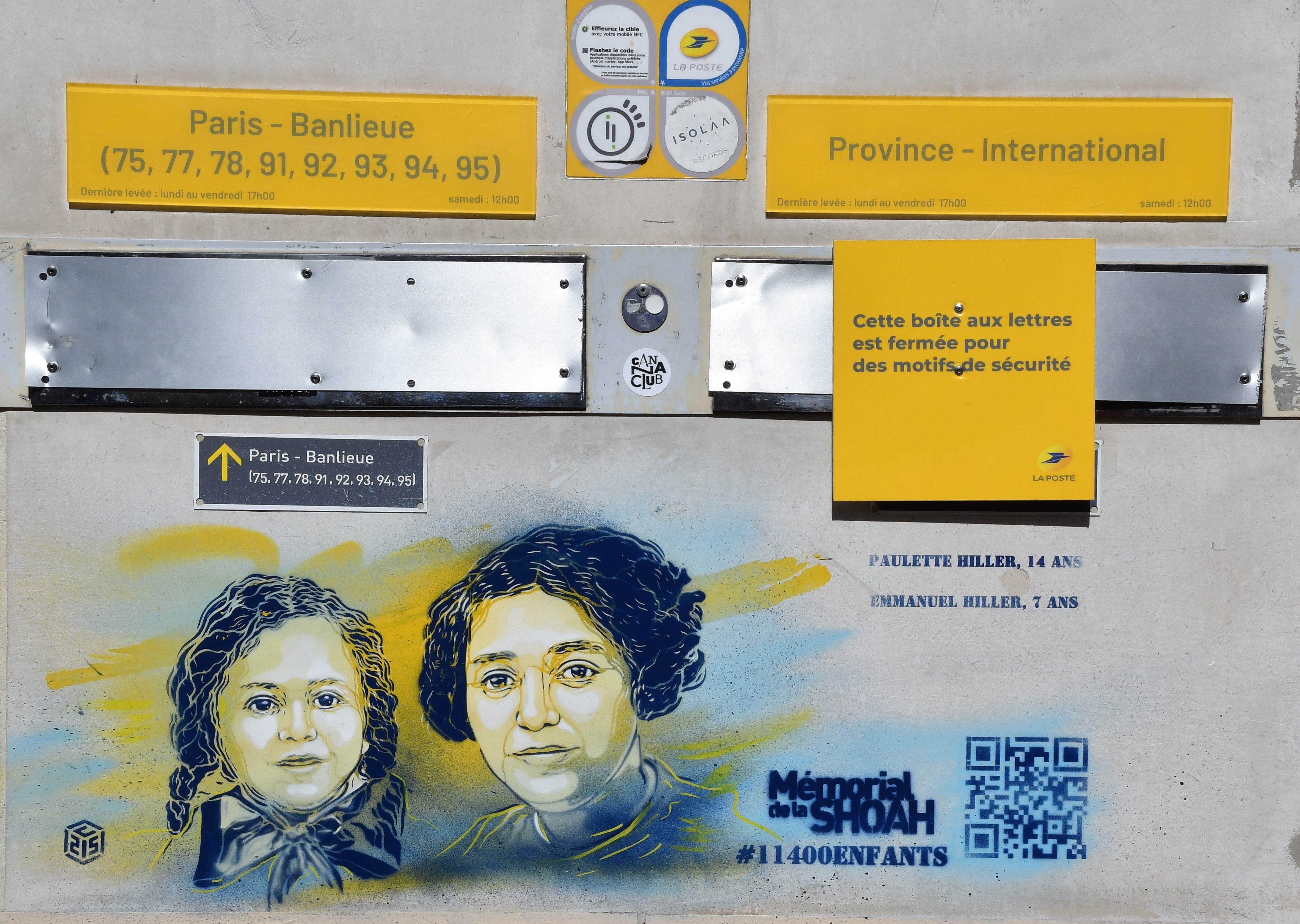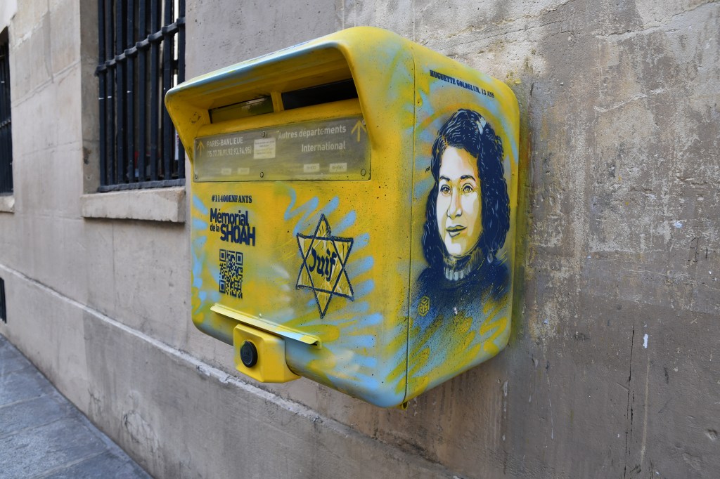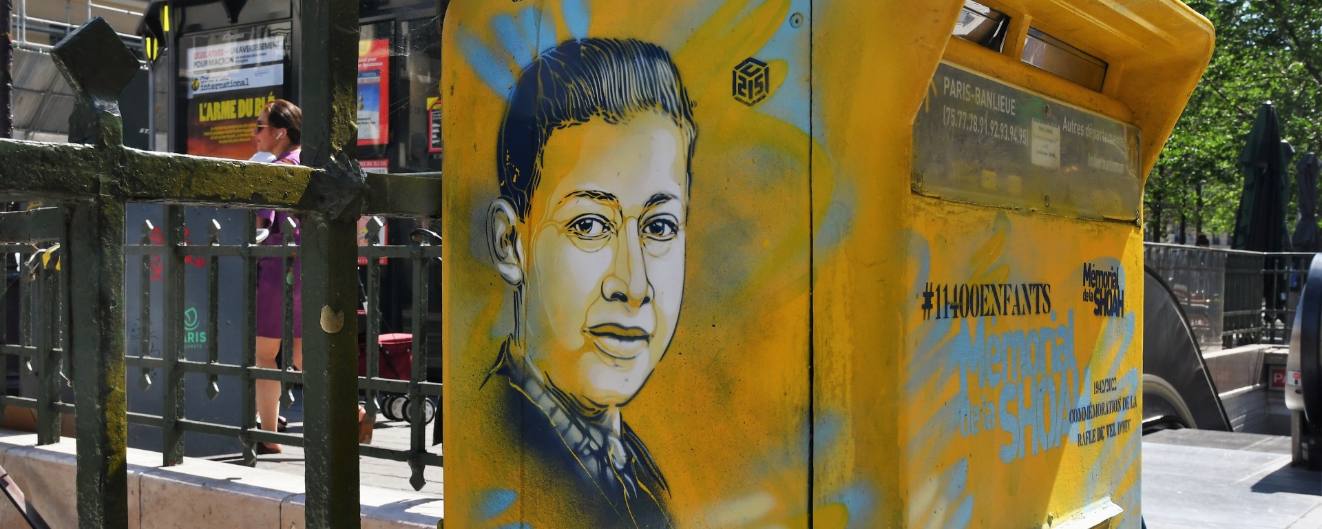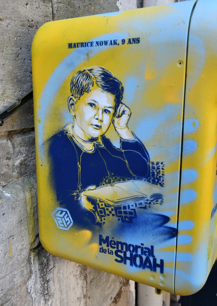 Son portrait, peint au pochoir sur une boite aux lettres du quartier par l’artiste de rue Christian Guémy, alias C215, est là pour nous rappeler qu’au cœur de Paris dans le Marais, 500 enfants juifs ont été raflés et conduits vers les camps de la mort.