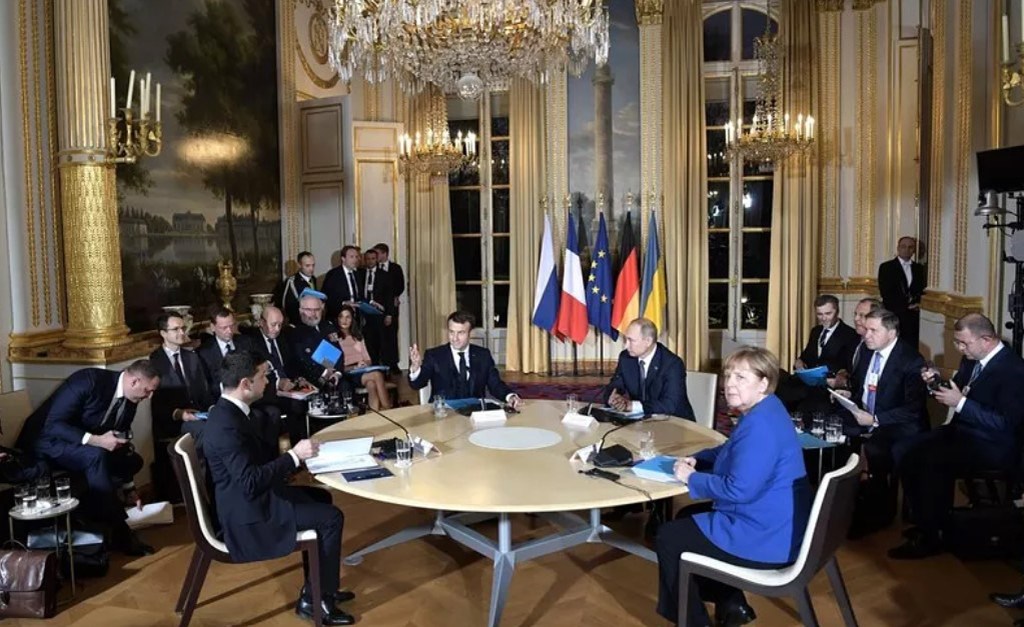 A la table des négociations: Zelensky, Macron, Poutine, Merkel. Paris: 9 décembre 2019. (c) Talweg.