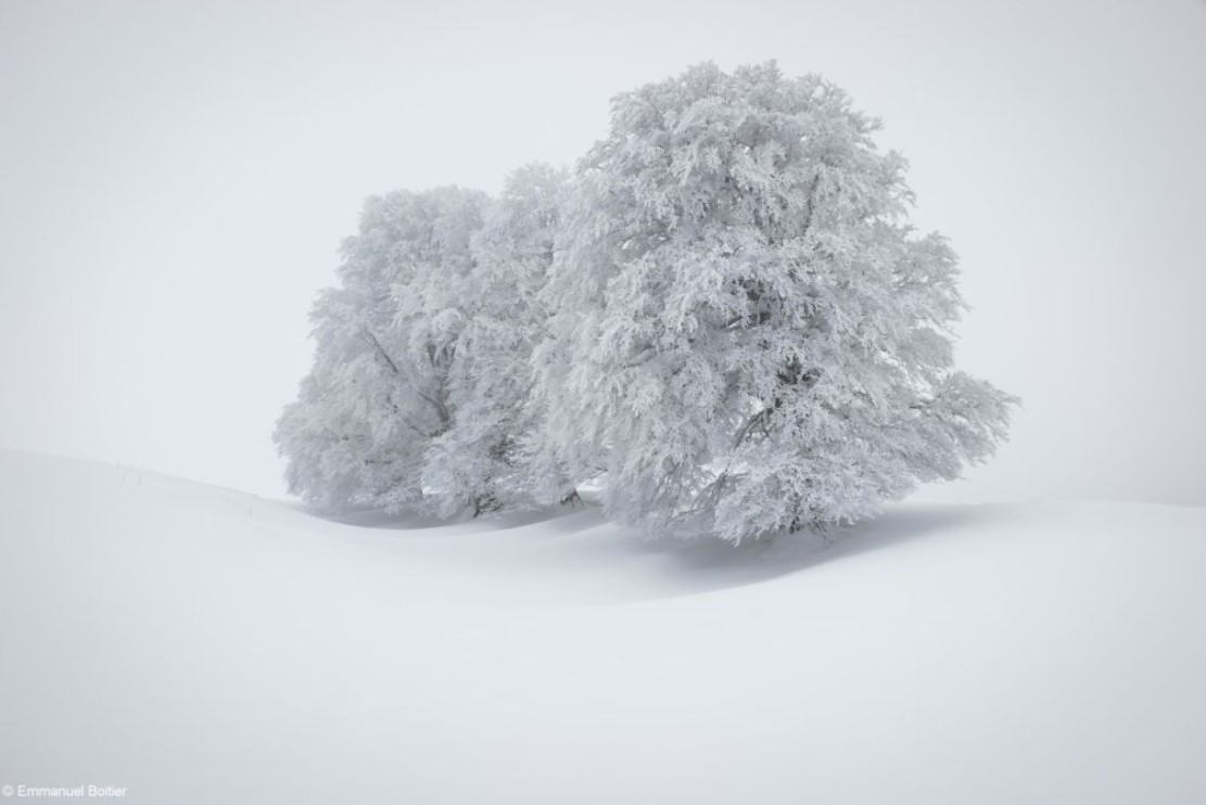 Je pense à Emmanuel Boitier avec ses Sentinelles du silence. (photo) Son cadre c’est l’Auvergne ; ses sujets les arbres, ceux qui se distinguent dans le froid, le givre, la brume, pliant sous le poids de la neige dans une ambiance glaciale. « Dans les montagnes d’Auvergne dit l’auteur, comme dans bon nombre de montagnes d’altitude moyenne, l’hiver s’étiole et la neige disparaît peu à peu. Photographier ces arbres sculptés de neige et de givre n’est aujourd’hui plus seulement un hommage, cela devient aussi un témoignage. »
