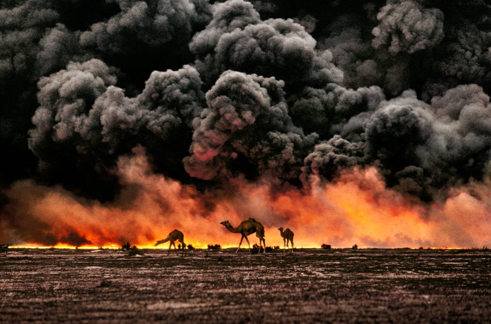 Chameaux et puits de pétrole en flamme durant la guerre du Koweit de 1991. (c) Steve McCurry.
