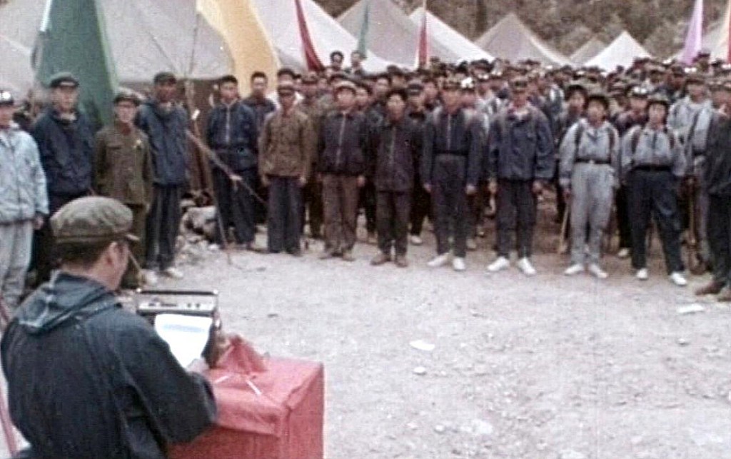 Prestation de serment d’un grimpeur portant le petit buste de Mao qui devait être déposé au sommet de l’Everest lors de l’expédition de 1960 mais dont personne n’a retrouvé la trace. (DR)