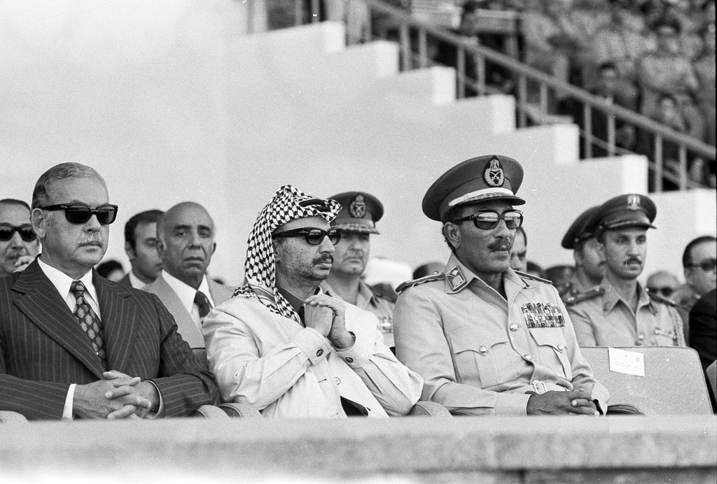 Anouar El Sadate à la tribune de commémoration de la guerre du Kippour où il sera assassiné le 6 octobre 1981. En compagnie de Yasser Arafat. (Photo Ph Rochot)