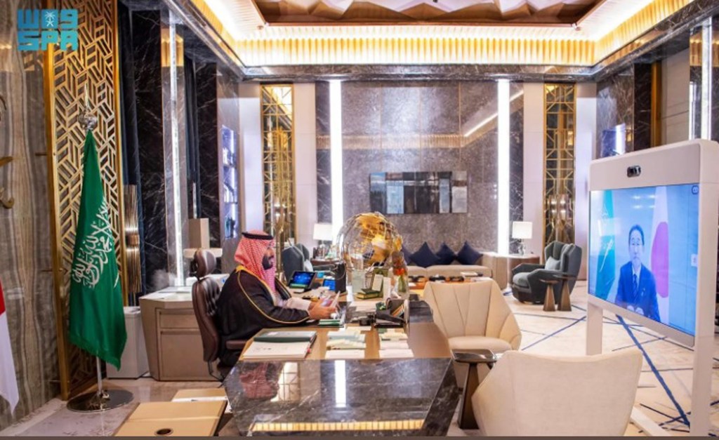 Mohamed ben Salmane, dans son bureau de Ryadh, en conversation avec le premier ministre japonais. (photo Agence saoudienne de Presse)