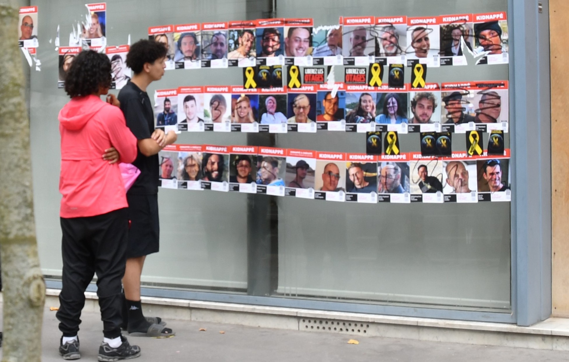 Portraits d’otages israéliens dans une rue de Paris. Ces affiches ont été souvent lacérées, déchirées, même celles représentant de jeunes enfants capturés par le Hamas le 7 octobre 2023. (c) Ph Rochot.